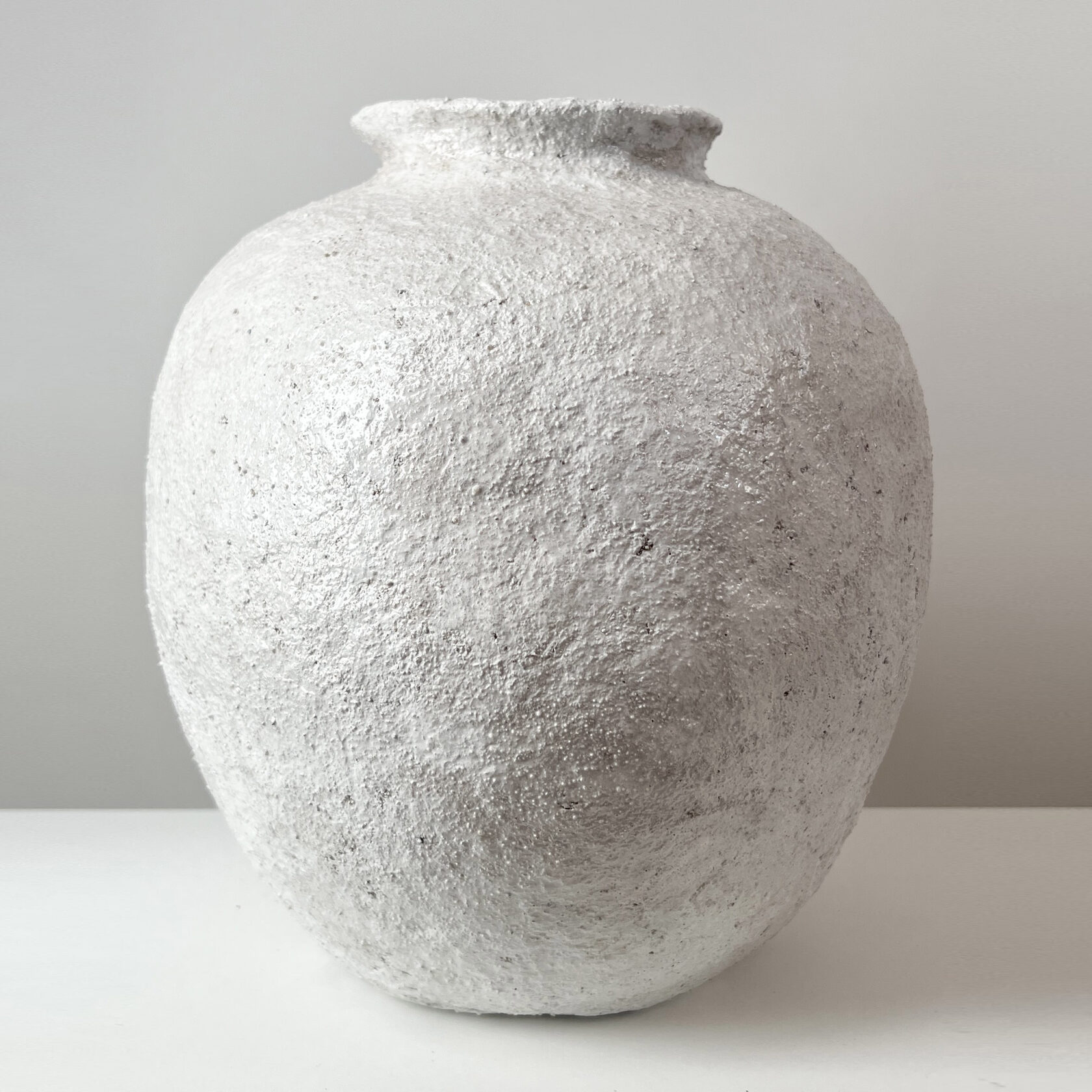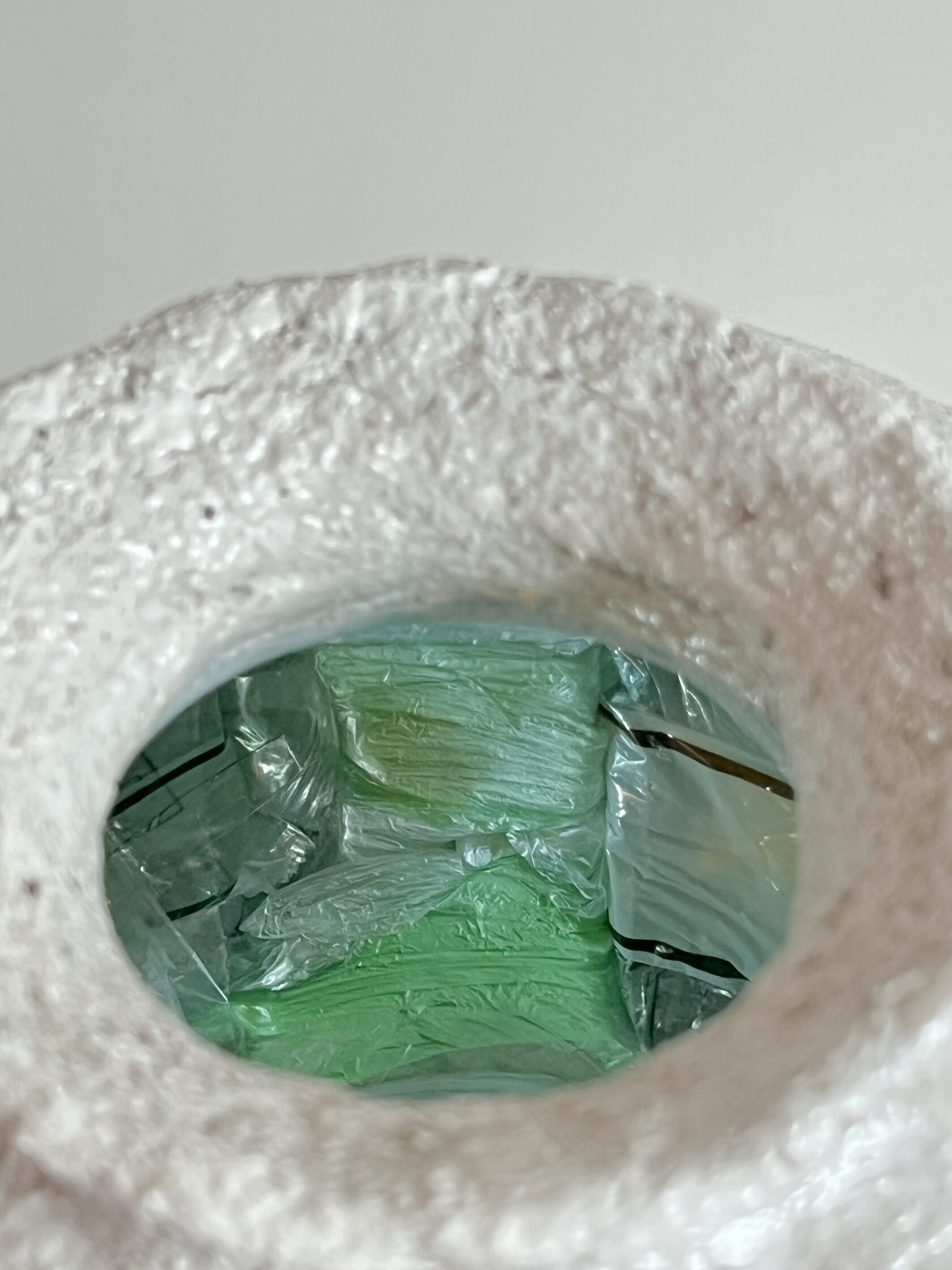 Предмет коллекционного дизайна, напоминающий керамику, но не являющийся керамикой. Объекты сделаны из папье-маше, которое наслаивается на основу, сформированную из неорганического мусора (полиэтиленовых пакетов, оберток от конфет, лопнувших воздушных шариков) как метафору ежедневного одноразового визуального шума.